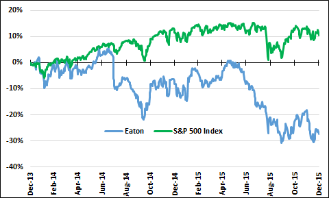 However, Eaton expects organic growth only from two of its divisions in 2015, and total organic revenue to decline by 1%. Excluding hydraulics, nine-month operating income would have been down only 0.6%. Given economic conditions, and some fairly significant expenditure on restructuring, this is not bad performance. Hydraulics is Eaton's problem child: After an already difficult 2014, the collapse in demand for oil, gas, mining, construction and agricultural equipment (nearly half the division's 2014 sales) has been crippling. Given this customer base, the division will not recover soon: The other half of its customers are machine-builders and other sorts of capital equipment producers, none of whom are seeing healthy demand. The stock market has not been at all forgiving: