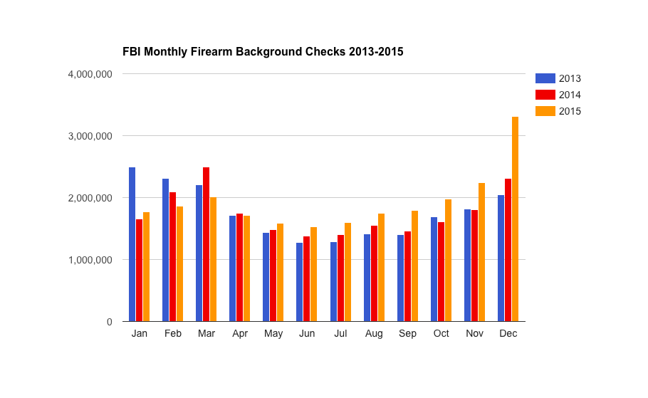 Beginning in May and continuing every single month thereafter, the FBI conducted more background checks on people wanting to buy a gun than at any other time for that particular month. It culminated in December, when more than 3.3 million investigations were conducted, the first time it ever cracked that threshold. For all of 2015, the FBI performed over 23 million background checks.