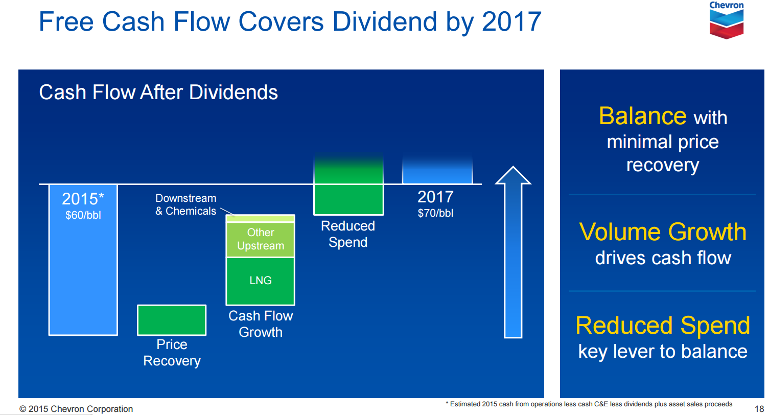 With many of these projects starting to wind down, though, Chevron is now in a position that it can drastically cut spending. By 2018, management expects to be spending $9 billion to $15 billion less between now and 2017.
