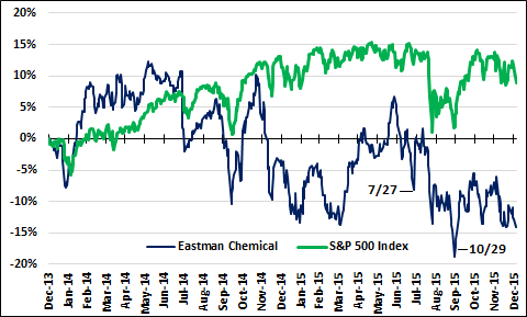 All of this has pushed Eastman's price down to 8.8 times the Yahoo! consensus for 2016 earnings. This is a remarkable valuation for a company that, although cyclical, has a long history of profitability, a sound balance sheet, and that raised its dividend by 15% on Dec. 3, boosting its yield to 2.7%. Although the Yahoo! consensus for 2016 earnings growth is only 5.6%, if the hedge funds are finally out of the way, it seems unlikely that Eastman will remain at such a low valuation indefinitely. Its shares should be less volatile as well.