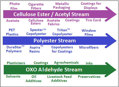 But chemical affinity does not provide a rational structure for a product portfolio. As the graphic suggests, the feedstocks stream branches in many directions: I'm reminded of the Saturday Night Live skit about a dessert topping that's also a floor wax. Eastman structures itself around its products' functionality:
