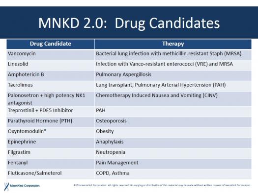 Now what: It's unknown if a new partner will step up to the plate to either to help MannKind commercialize Afrezza or explore new product candidates to utilize its inhaled drug-delivery technology. However, the company did provide investors with a look at all the product candidates that it is considering: