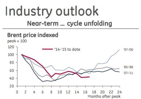 In his presentation, Simonelli compared the current oil price cycle to three prior cycles: