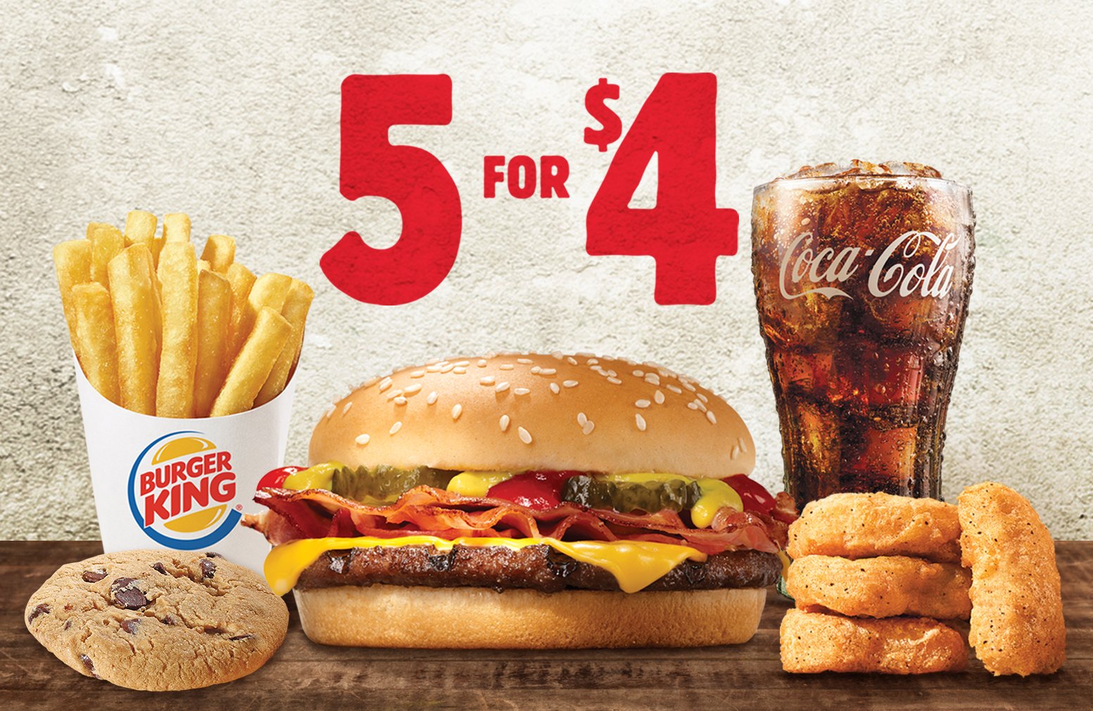 - Burger King 5 for $4: bacon cheeseburger, four-piece chicken nuggets, small fries, small soda, and a chocolate chip cookie.
