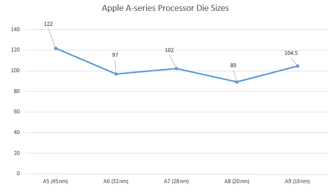 The trend in Apple's A-series chip sizes. Data sources: AnandTech and Chipworks.