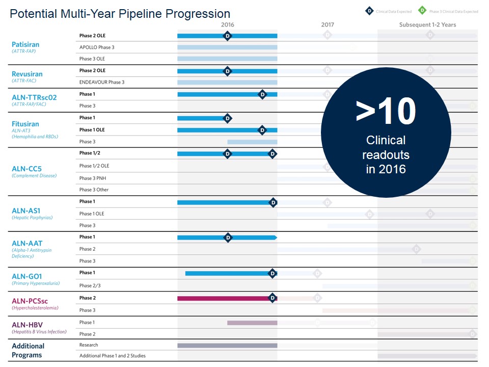 Alnylam won't file its first application to market drugs with U.S. and EU regulators until 2017 and might not get approved until 2018. To increase its value in 2016, Alnylam has to give investors more confidence that it can get its drugs approved through positive clinical readouts.
