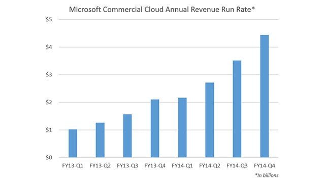 Microsoft's commercial cloud had an annualized revenue run rate of around $1 billion in the first quarter of its 2013 fiscal year. By the fourth quarter of that year, it had more than doubled, breaking above $2 billion. By the end of fiscal 2014, it had more than doubled again, and stood at $4.4 billion.