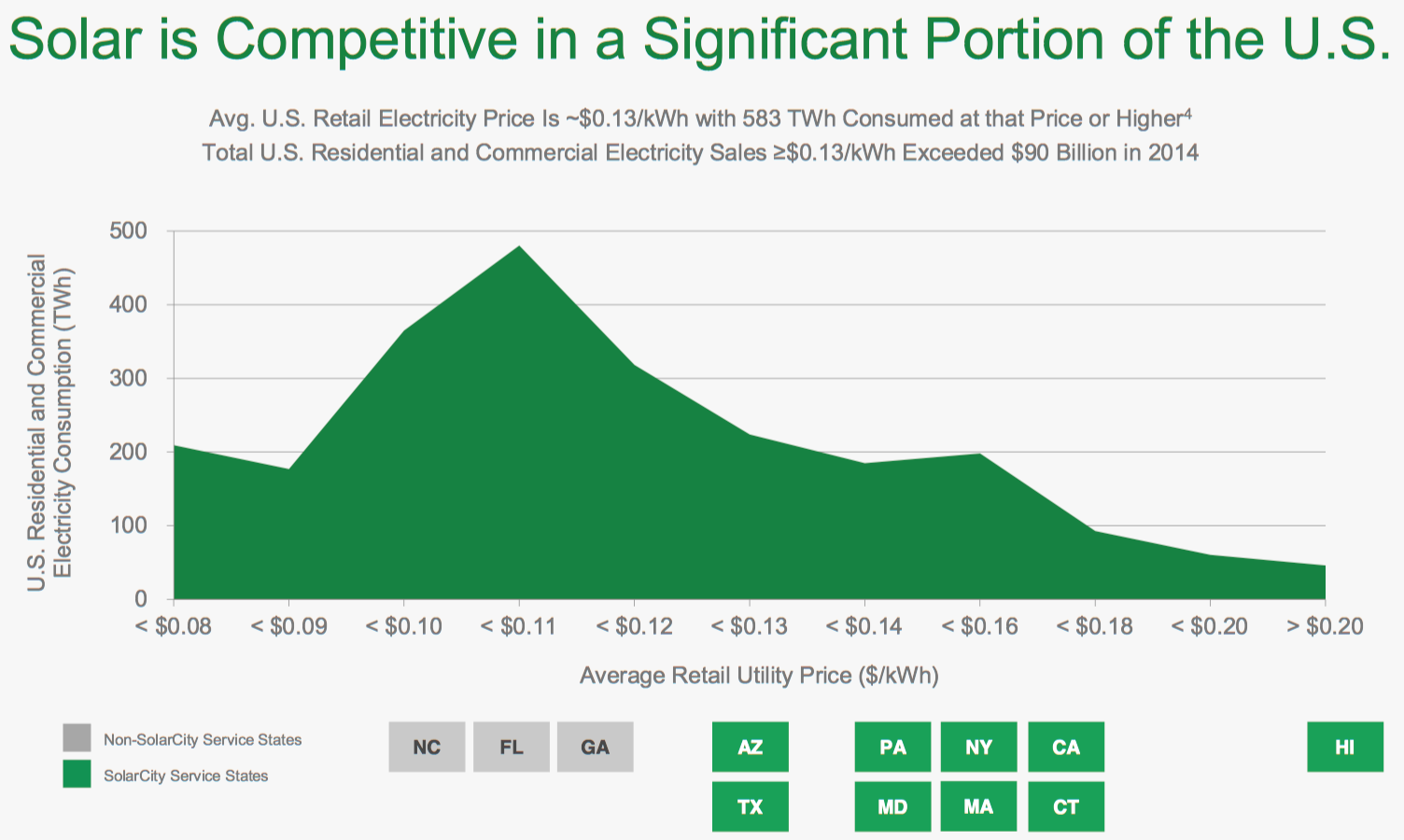SolarCity outlined how important these cost cutoffs are in the chart below. You can see that below $0.16 per kWh, each penny you can drop your price by opens up millions of potential new customers.
