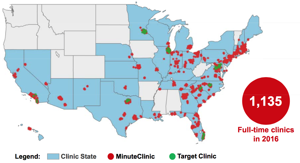 Thanks to the recent closing of the $1.9 billion acquisition of Target's (TGT 0.47%) pharmacy and clinic businesses, CVS now counts more than 9,500 retail stores in its empire, with more than 1,100 of these stores also offering walk-in medical services under the MinuteClinic name. The Target deal significantly expanded the company's footprint from the 7,800 retail stores and 900 clinics it owned at the end of 2014, and over the next two years the company plans on adding another 400 MinuteClinics to its network. Even then, there appears to be plenty of room left for MinuteClinic to expand.