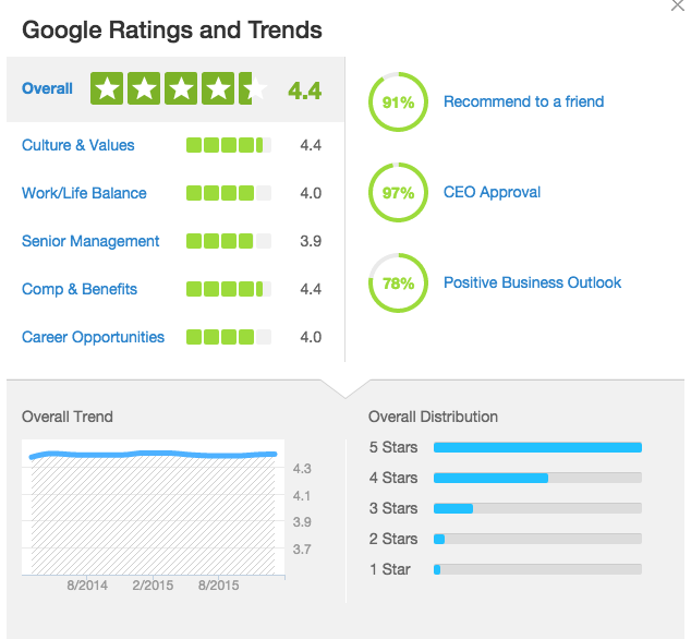 I firmly believe that when employees are happy and challenged in the work place, they are more likely to produce the kind of greatness that lasts for more than a generation. By using over 4,600 reviews on Glassdoor.com, it's pretty clear that Page and Brin have created a great workplace.