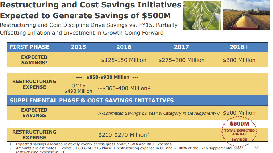 Recent commodity headwinds have forced the company to get more aggressive on the cost-cutting side of the ledger. Management expects forex volatility and a depressed commodity environment to drive down acres for growing crops. In response, the company is going to rein in operating spending, which is expected to save $500 million by 2018.