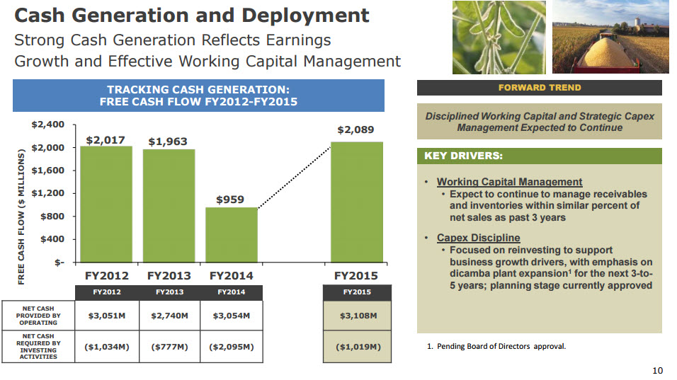 Monsanto has generated over $7 billion of free cash flow in the past four years. It's been able to accomplish this level of success through managing working capital at a highly disciplined level, by managing receivables and inventories within a similar percentage over the past three years. Its capex discipline has helped it focus on reinvesting on things that drive the growth of the business.