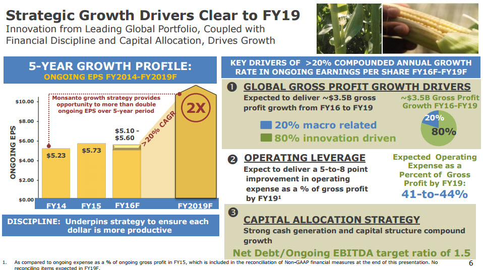 The company is positioned well for growth from strategic advancement and operational discipline. Growth from Seeds & Genomics is set to play a significant role in this growth strategy, as Monsanto expects to hit mid- to high-single-digit growth in gross profit from new corn hybrids globally, soybean penetration, and licensing opportunities. The growth initiatives, combined with a new $3 billion share repurchase program, should accelerate earnings growth to more than two times its current figure by 2019.