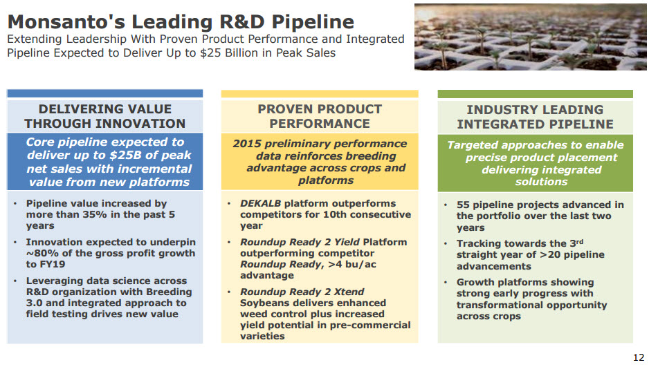 Labeling intellectual property as a sustainable competitive advantage is something that should be done with care. However, if Monsanto can continue to develop next-generation products through its extensive R&D budget of $1.5 billion per year, that's an enormous competitive advantage that many competitors simply cannot replicate.