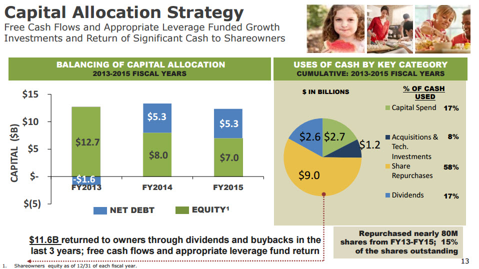 Management has been extremely shareholder friendly, having returned $11.6 billion to shareholders in the form of dividends ($2.6 billion) and share repurchases ($9 billion) since 2013. It recently completed a $6 billion buyback program and just initiated another $3 billion program. Overall, management has repurchased 15% of the shares outstanding since 2013. In addition, management has been able to generate returns on capital of over 22% the past three years, which shows its ability to allocate capital effectively.