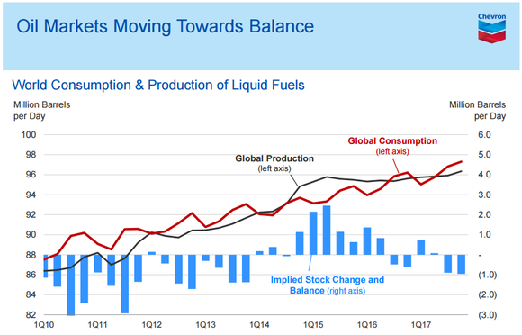 The goal is to balance cash by reining in current projects and reducing capital spending and operating expenses. It will also continue to sell assets where it's getting good value. Upstream earnings have taken a hit in this low-priced commodity environment, and the market has seen an influx of production in the past few years that has outpaced demand. However, the market is beginning to show signs of a rebalancing, with rig counts coming down and worldwide liquid supply and demand coming back in line.