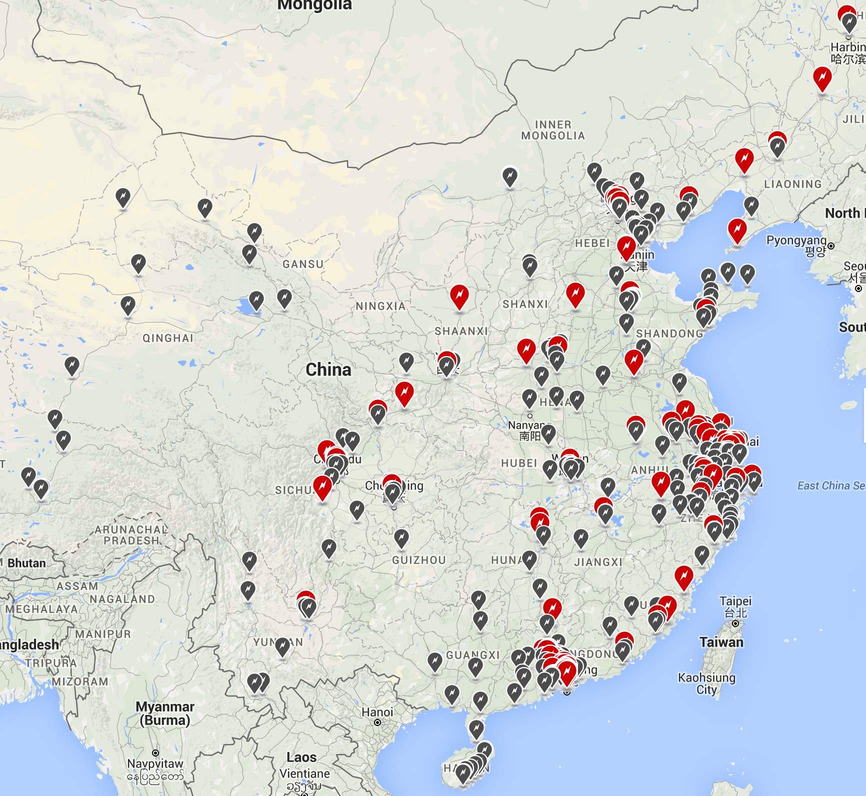 Tesla charging network in China. Gray icons indicate Destination Chargers. Red icons indicate Superchargers. Image source: Tesla Motors.