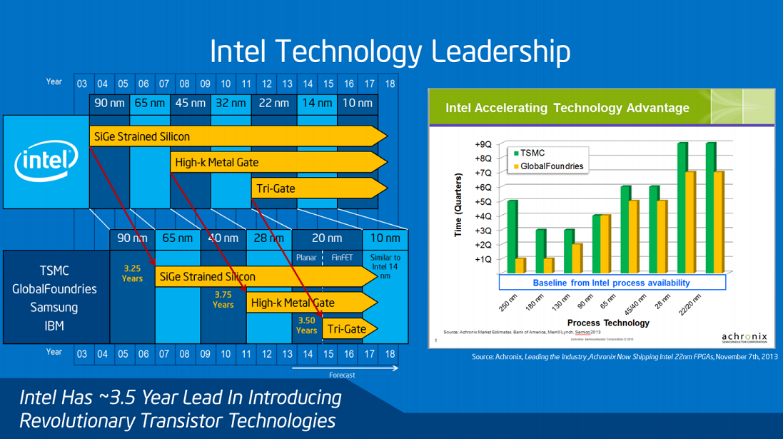 In late 2013, Intel trotted Bill Holt out to tell investors just how ahead the company was with respect to chip manufacturing technologies compared to the competition. The company showed the following slide, illustrating Intel's commanding and accelerating lead in terms of chip manufacturing technology relative to peers: