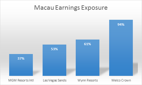Judging by percentage of profits derived from Macau, Melco Crown and Wynn Resorts have the most to gain -- and the most to lose -- based on Macau's performance. Even after a sharp downturn in Macau earnings, Wynn's resorts in the region account for 61% of total company EBITDA. Melco Crown derives substantially all of its business from Macau.