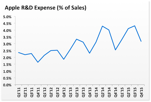 Apple is clearly searching for the next growth opportunity, and you can see it in the R&D figures. Cook said Apple continues to invest in R&D "without pause," saying that there are "great things in the pipeline."