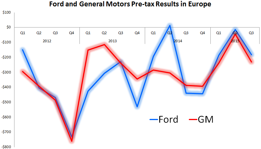 Ah, Europe, long a thorn in the side of U.S. automakers, which have struggled to post even a quarter of profits in the region since the financial crisis and ensuing recession. Ford's and General Motors' losses mirror each other, and both are slowly trending in the right direction.