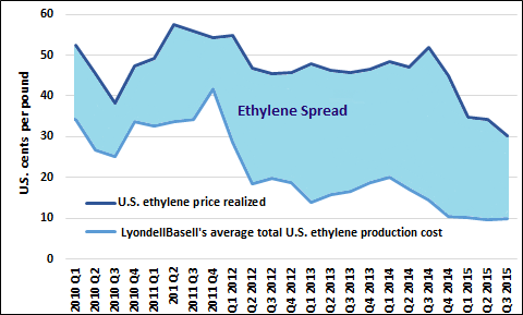 In the following chart, costs include labor and capital items, stable factors that smooth the volatile trend in hydrocarbons: The spread varied from 13.1 cents to 37.3 cents per pound. Ethylene is the chemical precursor to high-volume products including styrene, vinyl acetate, and polyethylene: LyondellBasell has capacity to produce 8.6 million tons of it annually.