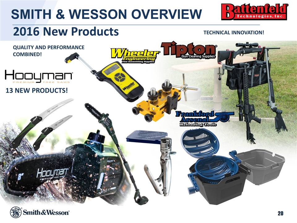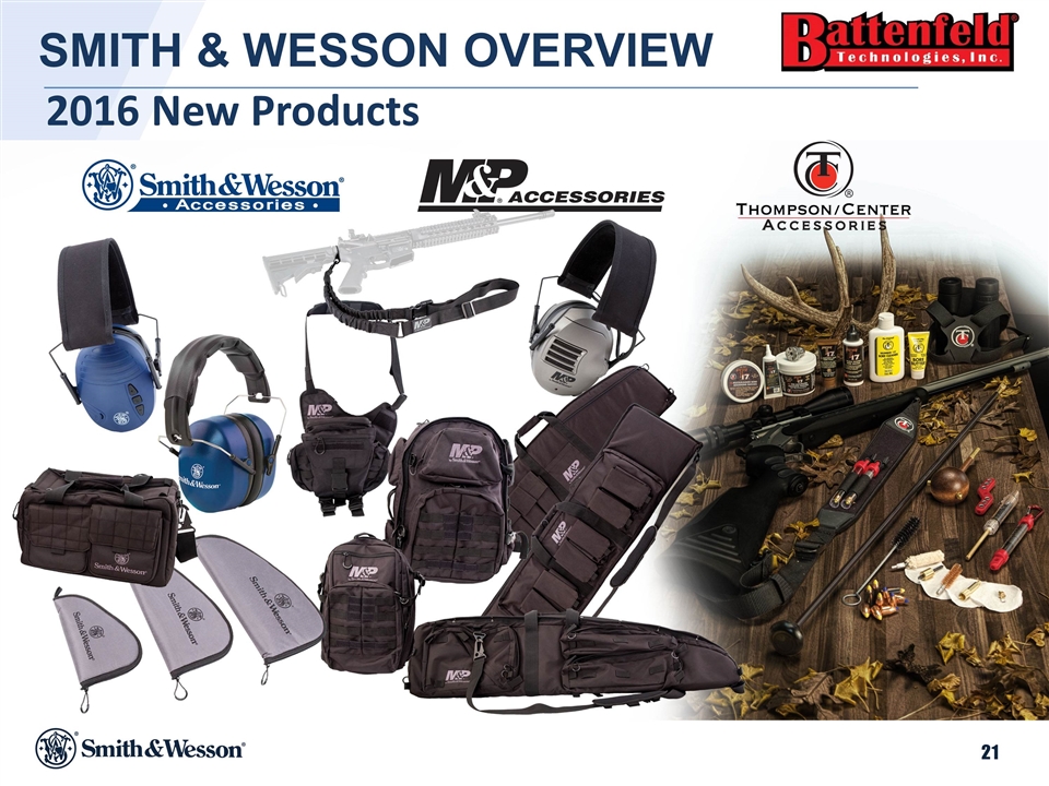 Through its acquisition of Battenfeld Technologies,Smith & Wesson already has an extensive lineup of outdoors gear. Image source: Smith & Wesson investor presentation, Jan. 19, 2016.