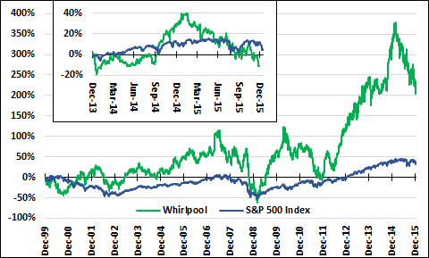 Whirlpool's stock-price history has been dominated by the "story" that it is the vehicle par excellence to profit from the rise of a middle class in the developing world. The story's credibility began to fade about a year ago, as emerging markets' troubles became clearer to investors: The stock peaked on March 2, 2015: