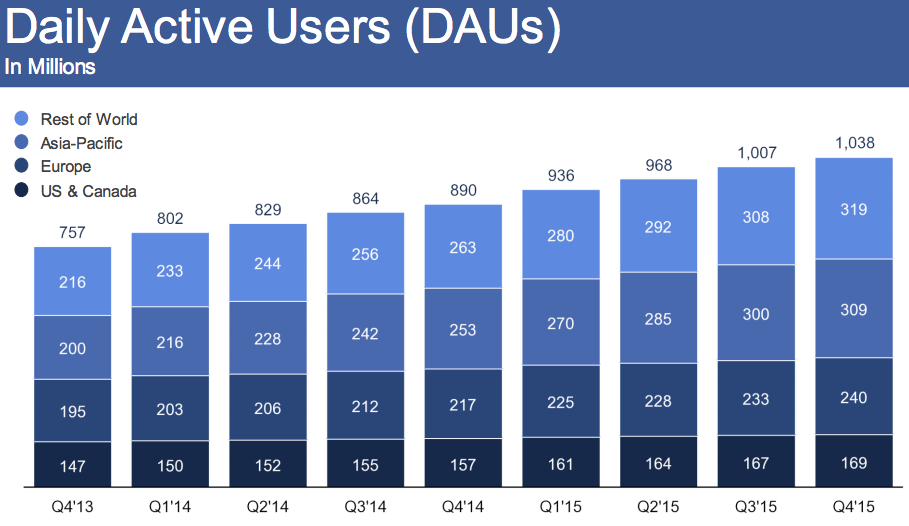 2. Facebook now has 1.59 billion monthly active users and 1.04 billion daily active users. It's difficult to overstate what an asset these figures are. The company's network effect -- a competitive advantage that grows more powerful with every additional user -- is as strong as ever.