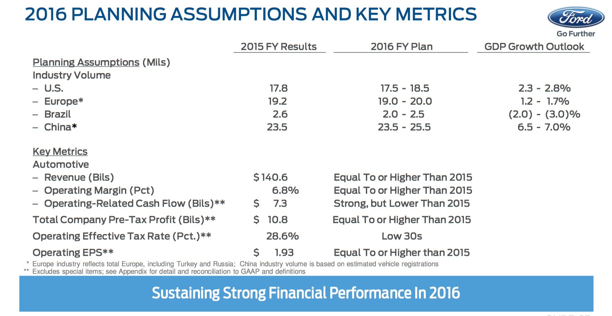 For 2016, Ford expects to match or beat its 2015 revenue, margin, pre-tax profit, and earnings per share. It expects strong operating-related cash flow, but not quite as high as 2015's, which was boosted by a "refilling" of Ford's coffers after the expenses of the F-150 launch in 2014.