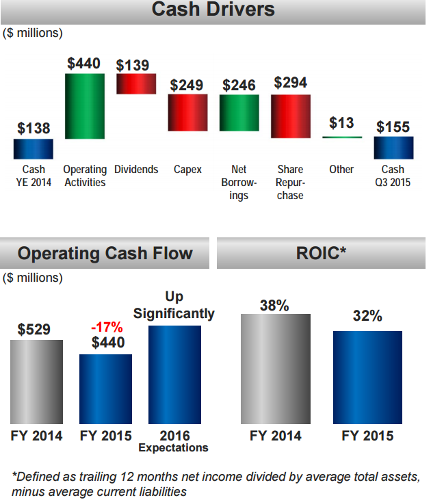 Looking first at Polaris' operating cash flow decline of 17%, which isn't something investors like to see, it's mostly explained by $144 million in increased factory inventory after the company had to slow shipments of its products in the fourth-quarter. Also, looking at the cash drivers portion of the graphic, management increased share repurchases during 2015 in part due to the stock price trading at historically low prices. Investors can also expect that Polaris' capital expenditures will move higher in 2016 as it continues to make Huntsville and Spirit Lake manufacturing investments.