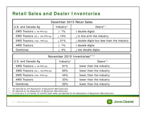In addition, AGCO's forecast for 2016 high-HP tractor industry retail unit sales is for a 15% to 20% decline, but 100-plus HP PTO tractor industry sales declined 31% in December. In comparison, Deere's overall forecast for North American agriculture and turf sales is for a 15% to 20% decline in 2016.