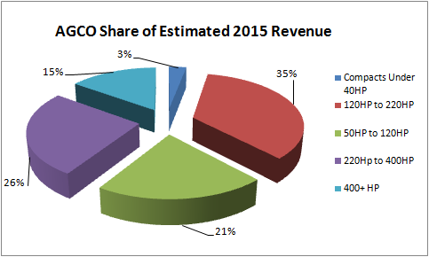 AGCO Corporation (AGCO 0.50%), owner of Massey Ferguson and Challenger, is also seeing pressure. A breakout of its estimated 2015 revenue shows its reliance on large agricultural machinery. Note that AGCO generates only around 3% of its revenue from the sub-40HP machinery market.