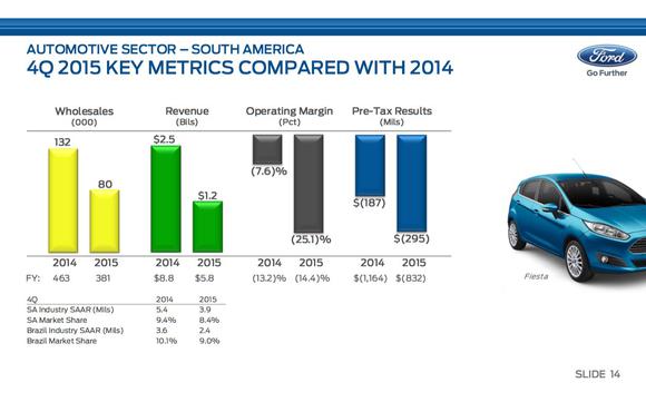 But the story was a lot different when it came to Ford's big operation in South America. Ford lost $187 million in South America before taxes in the fourth quarter, and it lost $832 million for the full year.