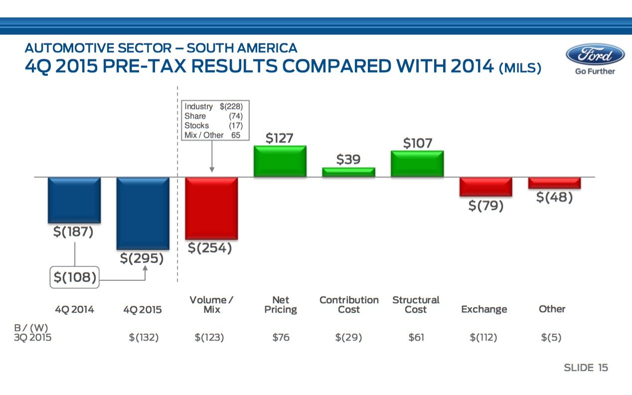 But the story was a lot different when it came to Ford's big operation in South America. Ford lost $187 million in South America before taxes in the fourth quarter, and it lost $832 million for the full year.