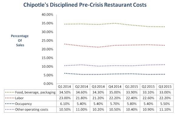 Fast forward to Q3 2015 in the last column. Chipotle booked total restaurant costs of 71.8%, resulting in a restaurant contribution margin of 28.2%. It's clear from the nicely even trend-lines of the chart, that from quarter to quarter, percentages don't change much -- Chipotle has run its restaurants with discipline and excellent consistency up until now.