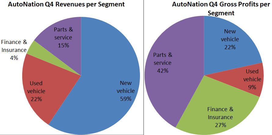 The good news for AutoNation shareholders is that while its gross profits per vehicle declined, the company's most profitable segment will continue to generate strong profitability regardless of what's going on with vehicle sales. That's because, despite not generating a big revenue figure, its parts and service business has far higher margins.