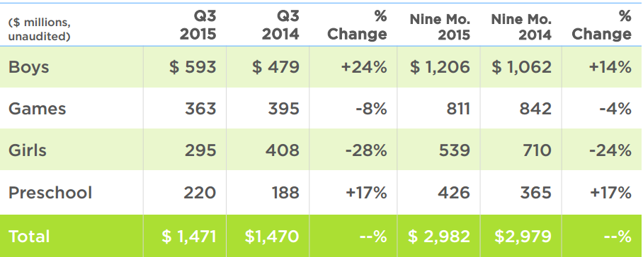 Growth in the preschool and boys categories has been fueling 2015 results, and we can probably expect more of the same. The girls category continues to be weak, but I suspect that has a lot to do with how Hasbro categorizes its offerings.