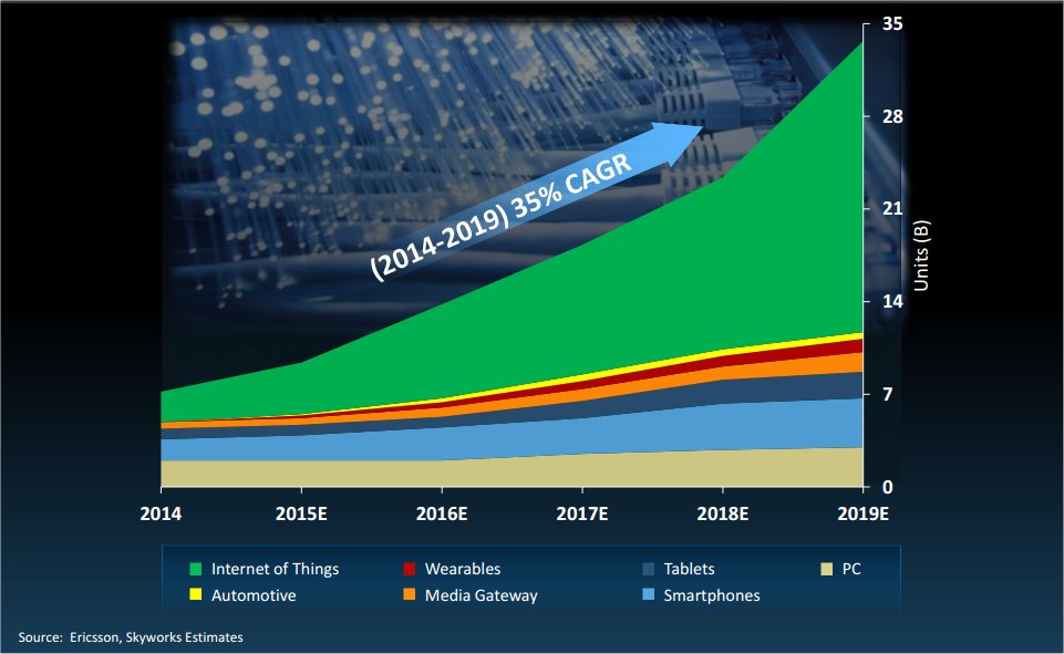 Many of Skyworks' new customers connect their devices to the Internet of Things (IoT), which connects cars, wearables, smart appliances, and other objects to the cloud. Skyworks estimates that between 2014 and 2019, the connected device market will grow at a compound annual growth rate of 35%. Based on the following chart from Skyworks' investor presentation, the importance of smartphones and tablets will fade as other IoT markets take over: