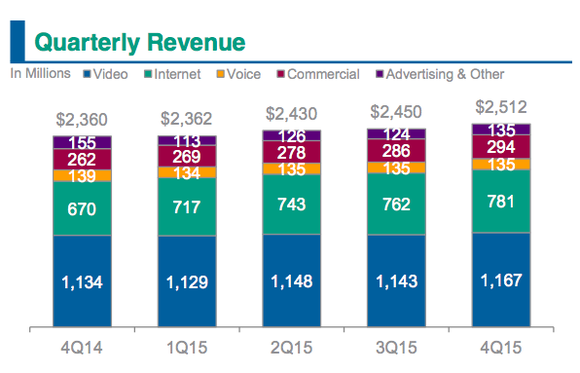 Charter's 2015 results mirrored the Q4 numbers on an expanded scale. Video gained 3.2% for the year to $4.58 billion and Internet revenue grew by an impressive 16.6% to just over $3 billion. Commercial revenue climbed as well to $1.12 billion, a 13.5% gain over 2014. The only declines were in ad sales, which dropped 9.5% to $309 million, and voice/phone services, which fell 6.4% to $539 million.