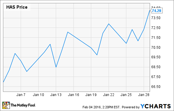 It was certainly with Hasbro (HAS +1.14%) in January, when a new line of Star Wars toys powered by the megablockbuster film Star Wars: The Force Awakens helped push its stock price from a Jan. 4 opening of $66.34 to a Jan. 29 close of $74.28, a nearly 12% gain, according to S&P Capital IQ data.