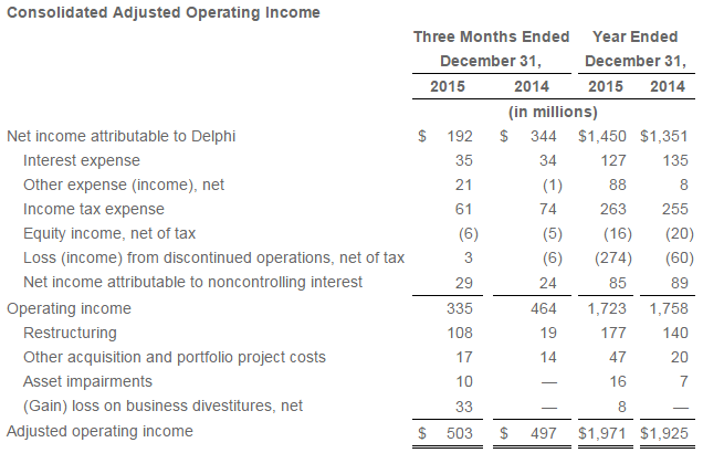 However, Delphi's adjusted figures tell a different story. Delphi's adjusted operating income, which excludes restructuring and other special items, checked in with a slight increase from $497 million during 2014's fourth-quarter up to $503 million last year. The story was similar for Delphi's adjusted net income which posted a slight gain from $386 million to $391 million, during the same time frame.