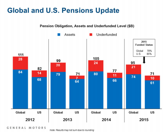 GM's U.S. pension obligation declined roughly $5 billion and its total global pension obligation declined about $9 billion, compared to 2014. Investors would probably like to see GM's pension funds closer to 85%-90% funded, but as it sits now, the automaker will probably only have to contribute between $500 million to $1.5 billion annually going forward, which is a night-and-day difference from pension plan contributions that often exceeded $4 billion annually in the years after emerging from bankruptcy.