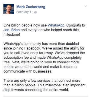 Facebook and CEO Mark Zuckerberg have long made it clear that their approach to creating lasting communications platforms emphasizes growth before monetization. However, the Facebook chief also cited 1 billion users as a critical juncture where monetization can now become a greater priority for WhatsApp's management, as you can see in a Facebook post from from Zuckerberg from earlier this week.