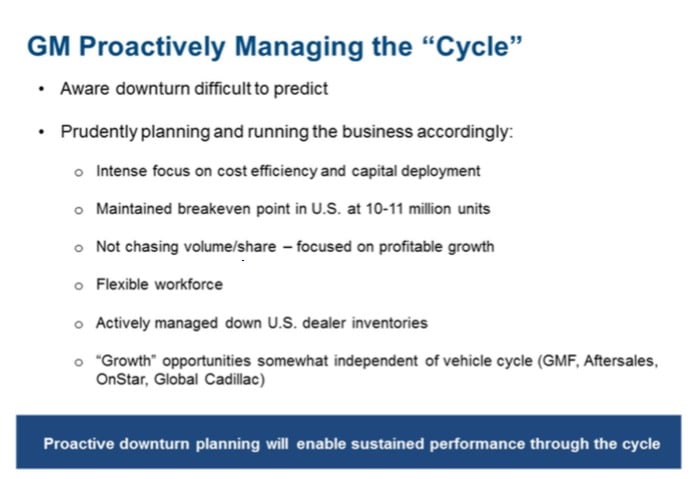 "And finally," Stevens said, "although keeping cost out of the system and looking for efficiencies are big drivers to protecting profitability in downturns, we are also executing several growth opportunities such as GM Financial, Aftersales, OnStar and global Cadillac that are somewhat independent of the vehicle cycle, fundamentally to improve our quality of earnings, peak-to-trough. We believe execution of our proactive downturn planning will enable sustained performance through the cycle."