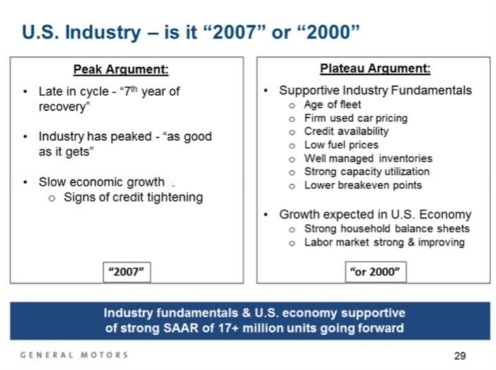 Stevens continued. "On the other hand, a number of people, including GM, believe the industry is plateauing with many years of strong performance ahead, similar to the 2000 to 2007 timeframe after the industry peaked in 2000."