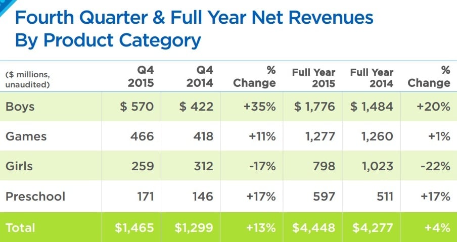 Hasbro generated 47% of its fourth quarter revenue in international markets. As a result, foreign exchange headwinds continued to weigh on results due to the continued strength of the U.S. dollar against other currencies. Excluding currency effects, revenue in the quarter jumped 23% year-over-year, while revenue for 2015 increased 13% overall.