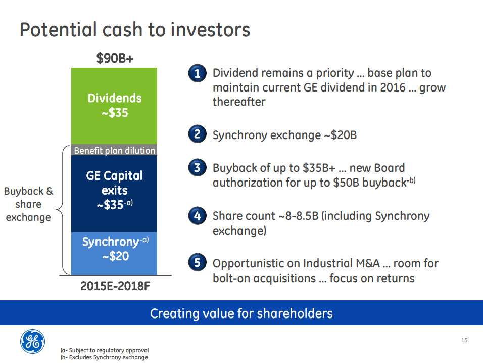 I understand investor contempt toward GE, given its 15 years of underperformance. However, we're entering a new era for GE. I believe investors should do very well at current levels over the long term, with a free cash yield of 5% and a dividend yield of 3.81%. In the next two to three years, shareholders will see tremendous amounts of capital returned to them in the form of share buybacks, dividends, and spinoffs. At the end of this process, investors are likely to get a better focused, leaner business with a much lower risk profile. The high-return industrial business lines, which will comprise 90% of GE by 2018, should provide increased shareholder value via increased focus and world-class competitive advantages.