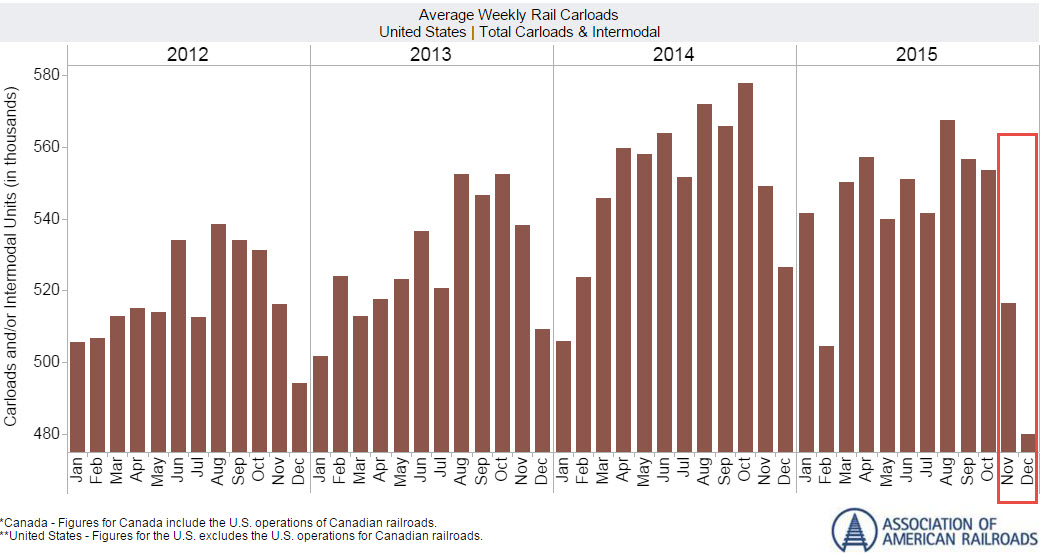 With the volume slowdown in the railroad industry, it appears we're seeing potential headwinds in the overall economy right now. Low energy prices are likely to pressure earnings for the coming quarters, barring a sudden price surge. Total volumes are expected to come under pressure, and management says it expects coal to continue its decline. The drop in energy prices will shut in a significant amount of U.S. production, and we've seen major oil and gas companies cut back billions in capex over the past year, a trend that's expected to continue into 2016.