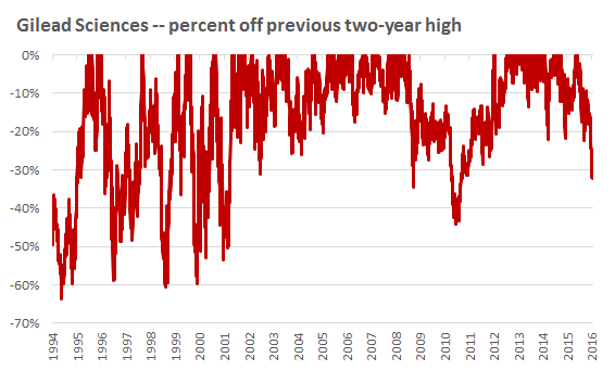 Or consider Gilead Sciences (NASDAQ: GILD). It increased 21,000% over the last 20 years. But shares spent more of that period down 30% or more than they did anywhere near a new high: